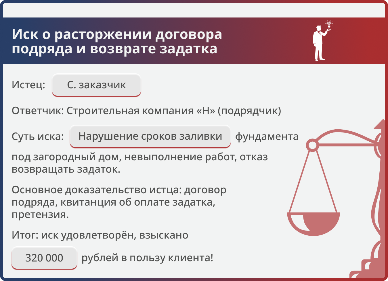 Наш клиент С. решил построить загородный дом и 12 сентября подписал договор со строительной компанией «Н» на заливку фундамента. Срок был установлен до 30 сентября. С. выплатил задаток 108 000 рублей. Однако подрядчик не торопился: работы начались позже, к обещанной дате фундамент готов не был. Начались осенние дожди и похолодание — заливка бетона стала невозможной, и стройку пришлось отложить на неопределённый срок. С. обратился к нам. Мы посоветовали направить подрядчику письменную претензию с требованием расторгнуть договор и вернуть задаток. Компания «Н» на мировую не пошла. Тогда мы подготовили исковое заявление в суд и отстаивали интересы клиента в рамках Закона о защите прав потребителей.